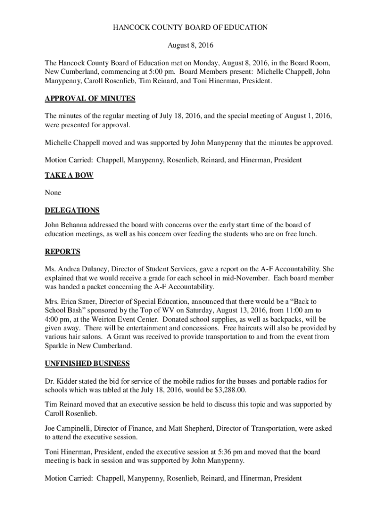 HANCOCK COUNTY BOARD OF EDUCATION August 8, 2016, The Hancock County Board of Education met on Monday, August 8, 2016, in the Board Room, New Cumberland, commencing at 5:00 pm. Board Members present: