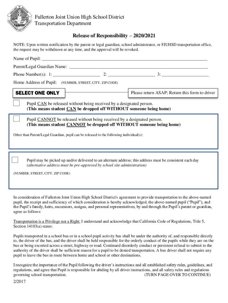 Fullerton Joint Union High School District Transportation Department Release of Responsibility 2020/2021 NOTE: Upon written notification by the parent or legal guardian, school administrator, or FOUND