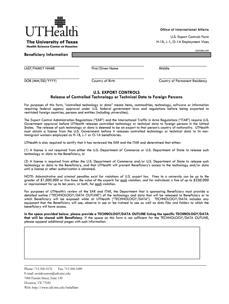Este formulario se utiliza para la certificación y revisión de la tecnología controlada o datos técnicos que se liberan a beneficiarios no inmigrantes empleados como H-1B, L-1 o O-1A en UTHealth.