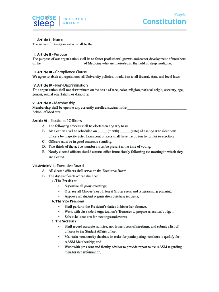 (Sample)Constitution I. Article I Namath name of this organization shall be the___ II. Article II Purpose of our organization shall be to foster professional growth and career development of members