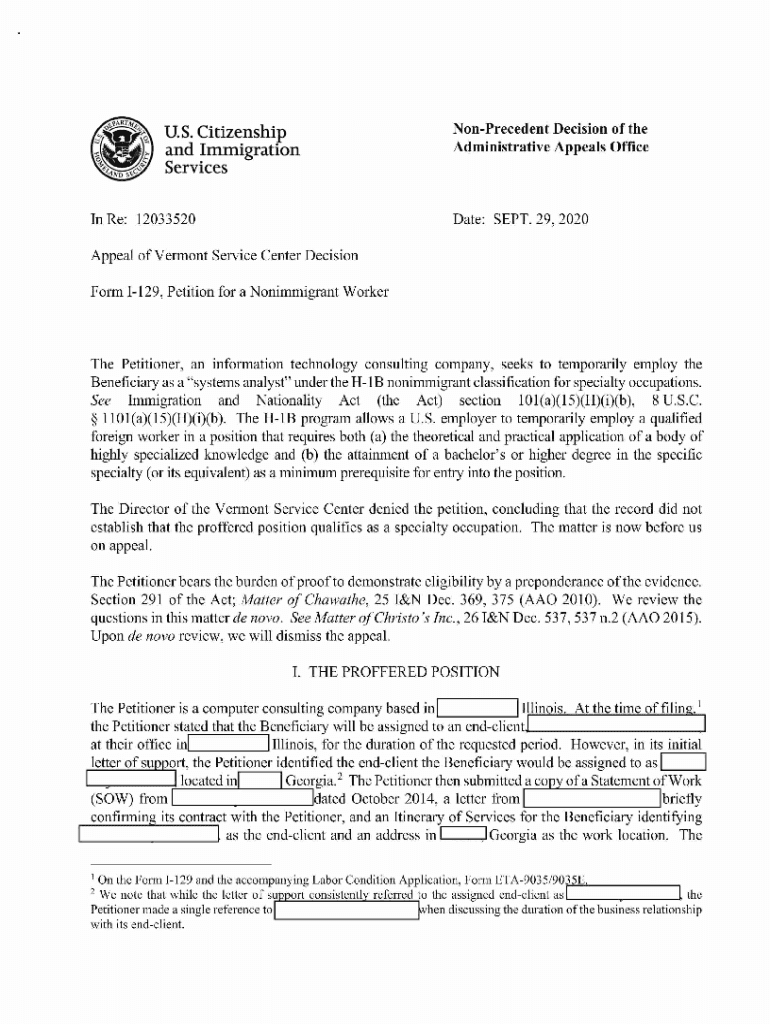 Administrative Appeals Officiate: SEPT. 29, 2020Appeal of Vermont Service Center Decision