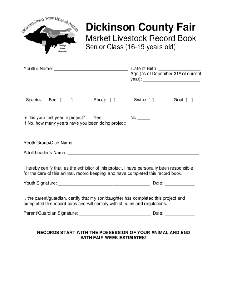 Dickinson County Fair Market Livestock Record Book Senior Class (1619 years old) Youths Name: ___ Date of Birth: ___ Age (as of December 31st of current year): ___Species:Beef []Sheep [ ]Swine [ ]Goat