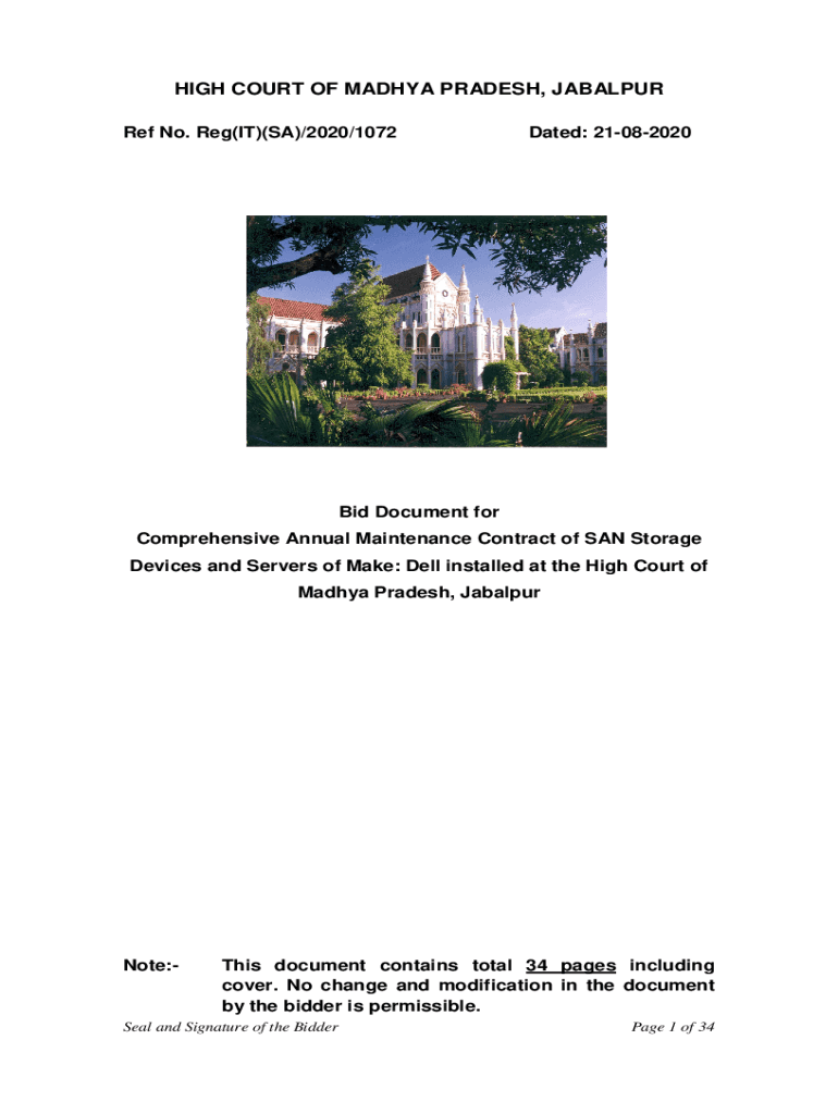 HIGH COURT OF MADHYA PRADESH, JABALPUR Ref No. Reg(IT)(SA)/2020/1072Dated: 21082020Bid Document for Comprehensive Annual Maintenance Contract of SAN Storage Devices and Servers of Make: Dell installed