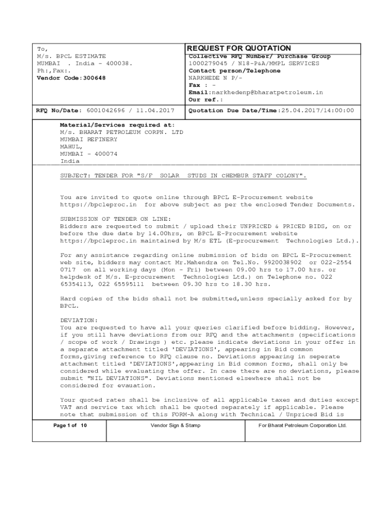 To, M/s. BCL ESTIMATE MUMBAI. India 400038. PH:, Fax:. Vendor Code:300648REQUEST FOR QUOTATION No/Date: 6001042696 / 11.04.2017Quotation Due Date/Time:25.04.2017/14:00:00Collective RFQ Number/ Purchase