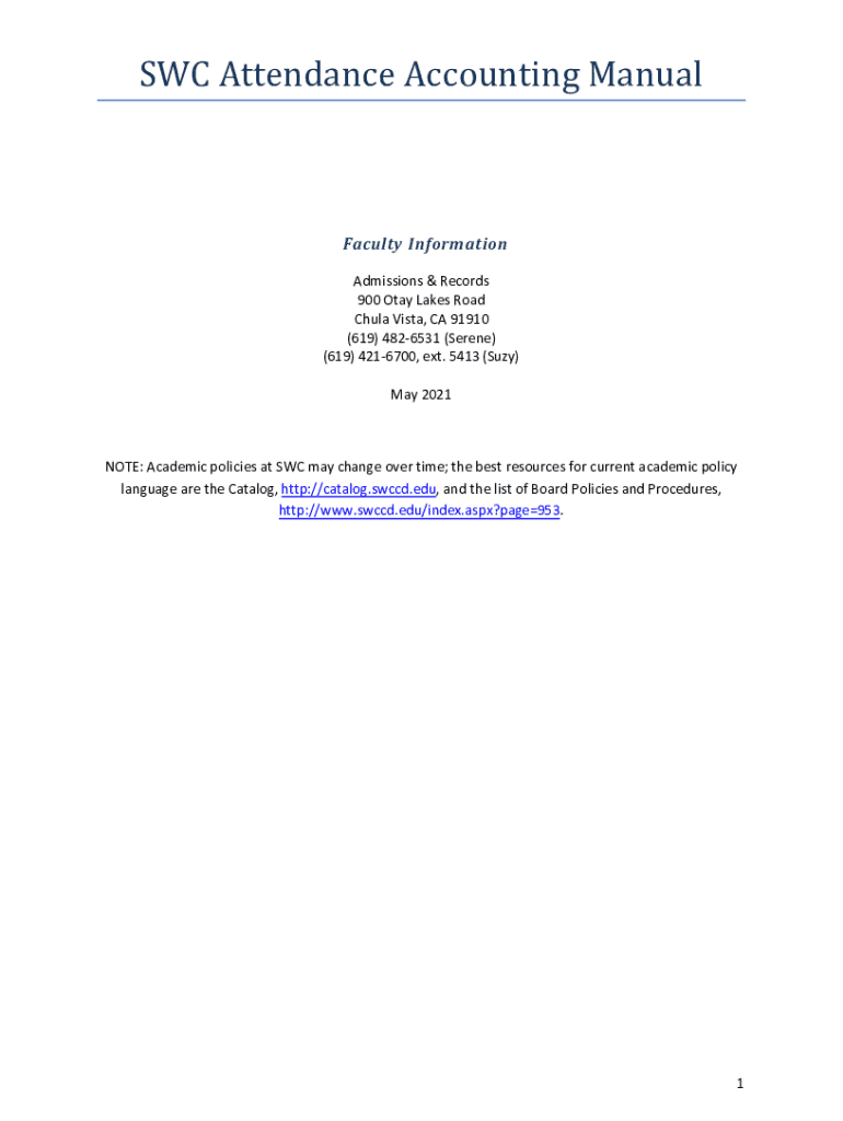 SIC Attendance Accounting Manual Faculty Information Admissions & Records 900 Okay Lakes Road Chula Vista, CA 91910 (619) 4826531 (Serene) (619) 4216700, ext. 5413 (Suzy) May 2021NOTE: Academic policies