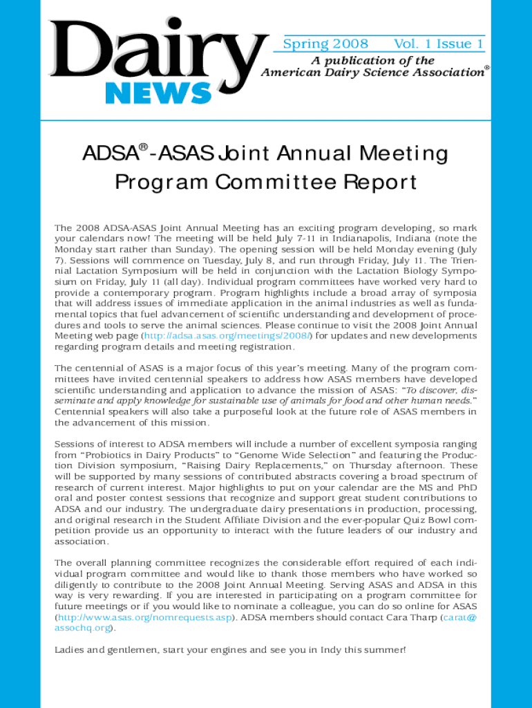 Spring 2008Vol. 1 Issue 1A publication of the American Dairy Science AssociationADSAASAS Joint Annual Meeting Program Committee Report The 2008 ARKANSAS Joint Annual Meeting has an exciting program