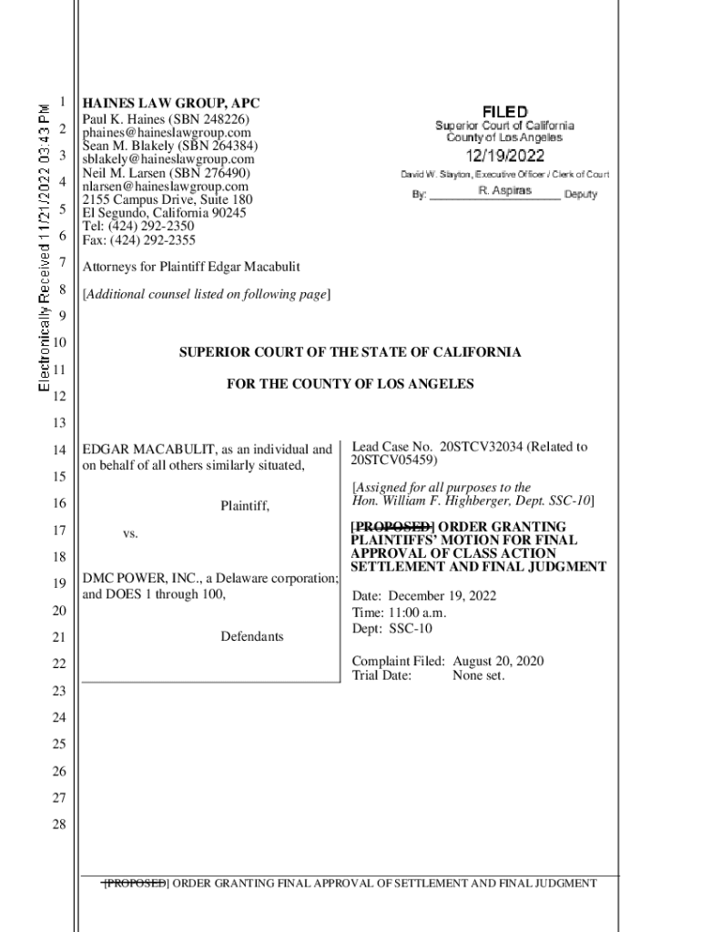 16HAINES LAW GROUP, APC Paul K. Haines (SON 248226) phaines@haineslawgroup.com Sean M. Blakely (SON 264384) sblakely@haineslawgroup.com Neil M. Larsen (SON 276490) nlarsen@haineslawgroup.com 2155