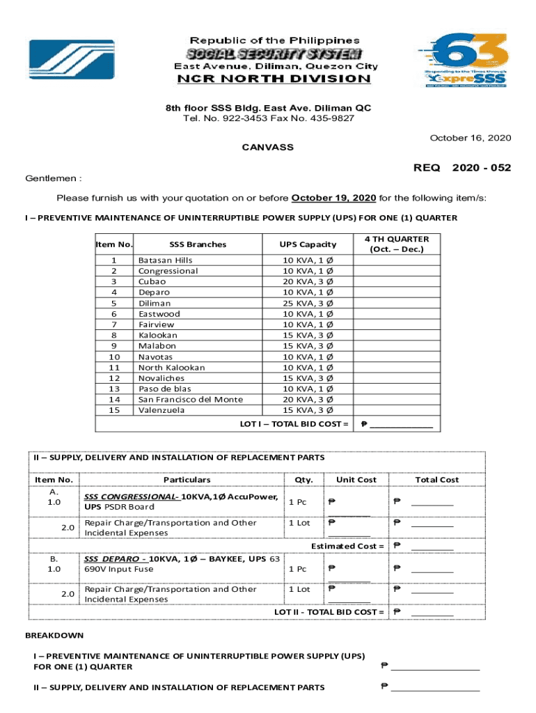 8th floor SSS Bldg. East Ave. Dalian QC Tel. No. 9223453 Fax No. 4359827 October 16, 2020CANVASSREQ 2020 052Gentlemen :Please furnish us with your quotation on or before October 19, 2020, for the