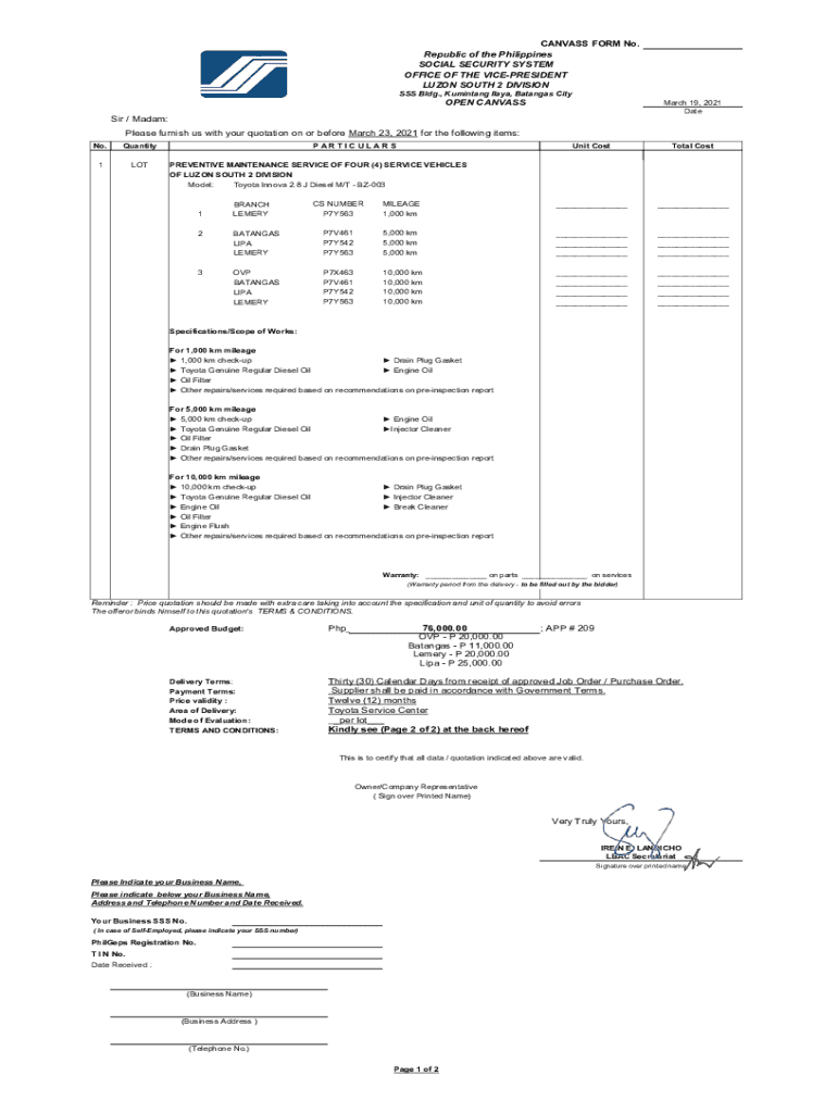 CANVASS FORM No. Republic of the Philippines SOCIAL SECURITY SYSTEM OFFICE OF THE VICEPRESIDENT LUZON SOUTH 2 DIVISION SSS Bldg., Kuomintang Ila ya, Bananas Citroën CANVASS March 19, 2021, Date Sir