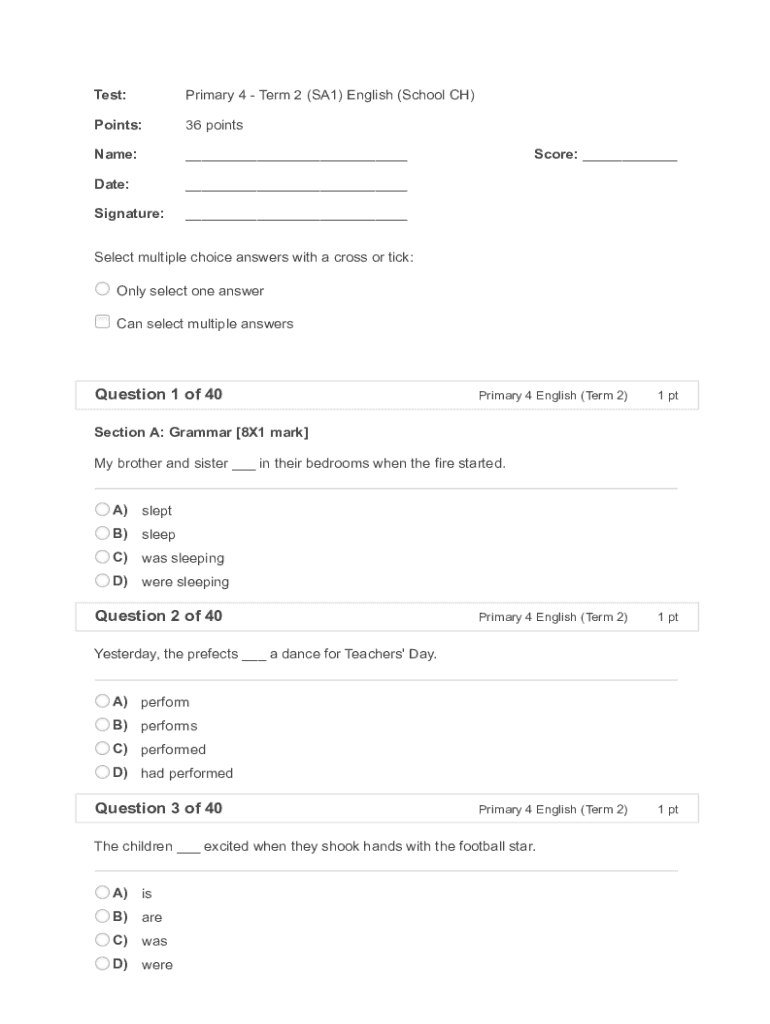 Test:Primary 4 Term 2 (SA1) English (School CH)Points:36 pointsName:___Date:___Signature:___Score: ___Select multiple choice answers with a cross or tick: