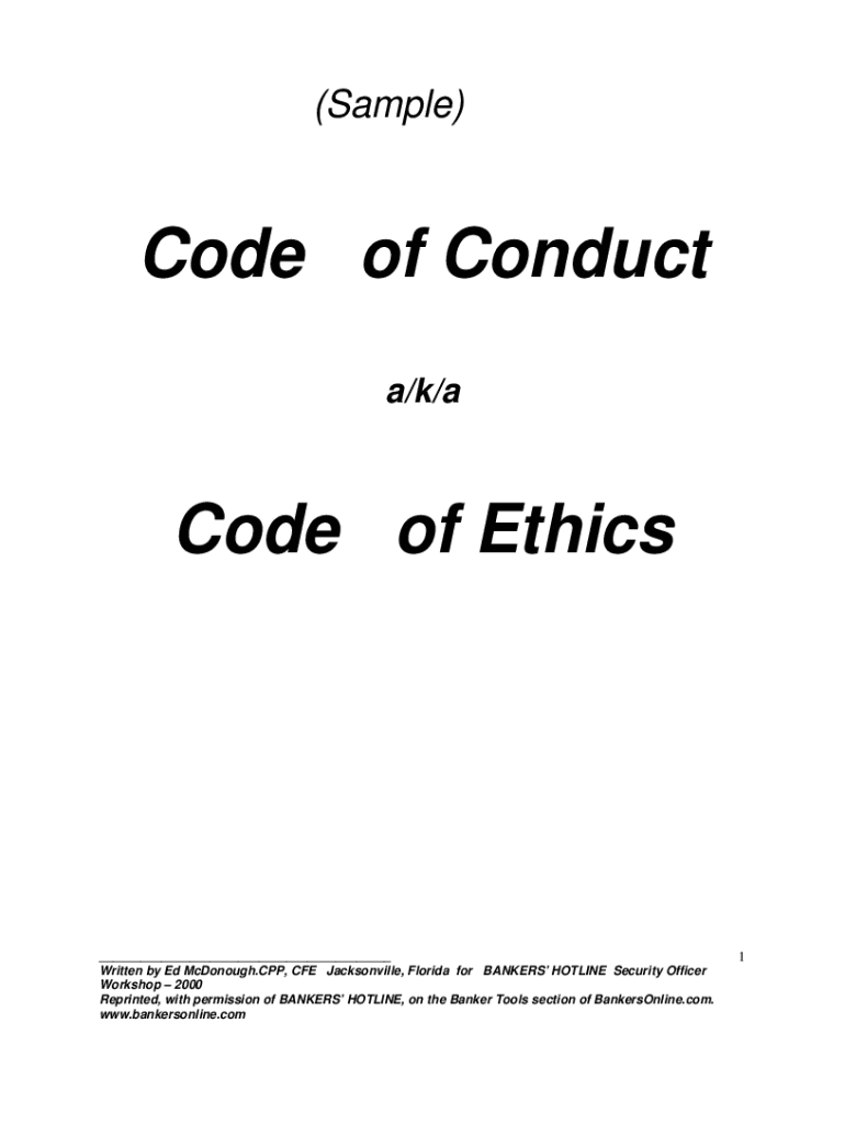 (Sample)Code of Conduct a/k/code of Ethics___ Written by Ed McDonough. CPP, CFE Jacksonville, Florida for BANKERS HOTLINE Security Officer Workshop 2000 Reprinted, with permission of BANKERS HOTLINE,