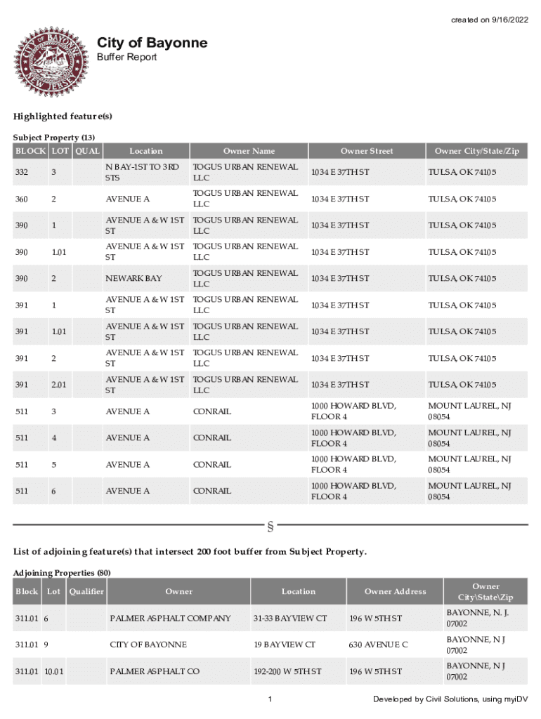 Created on 9/16/2022City of Bayonne Buffer ReportHighlighted feature(s) Subject Property (13) BLOCK LOT Allocation N BAY1ST TO 3RD STS33233602AVENUE A39013901.01AVENUE A & W 1ST ST AVENUE A & W 1ST
