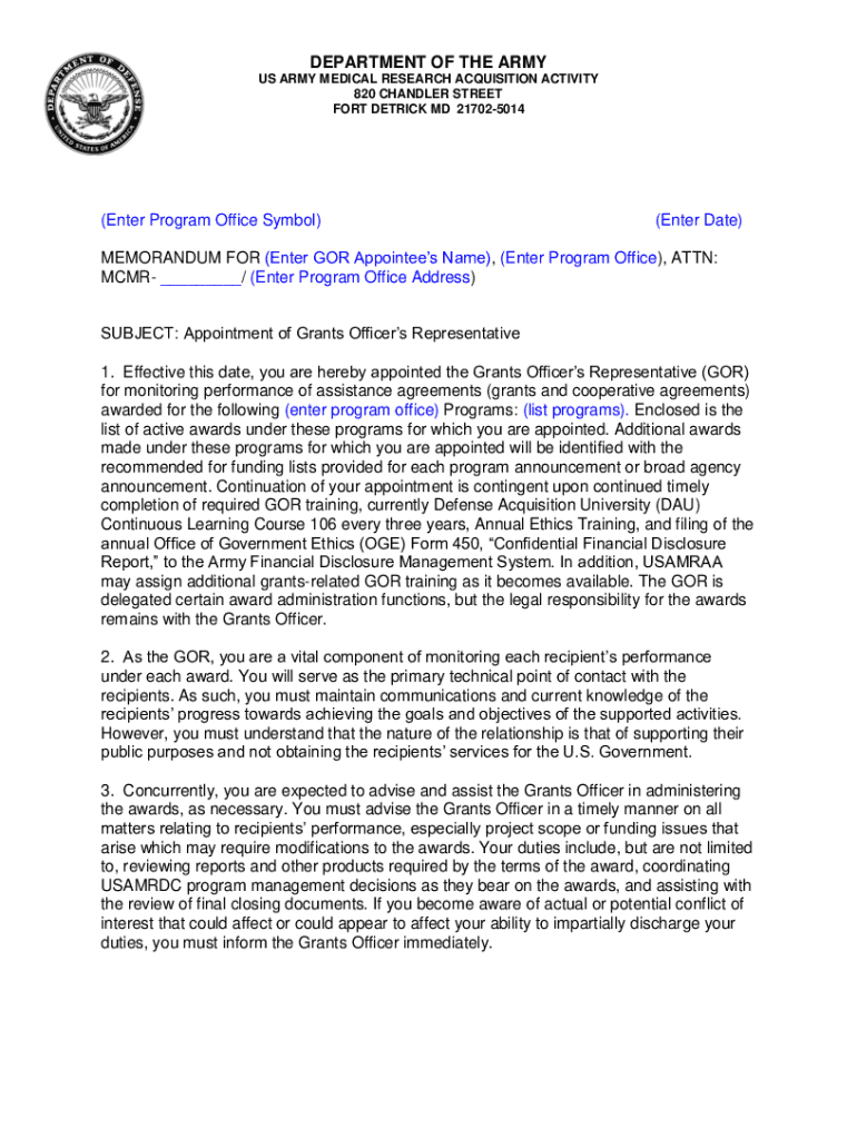 DEPARTMENT OF THE ARMY US ARMY MEDICAL RESEARCH ACQUISITION ACTIVITY 820 CHANDLER STREET FORT DERRICK MD 217025014(Enter Program Office Symbol)(Enter Date)MEMORANDUM FOR (Enter FOR Appointees Name),