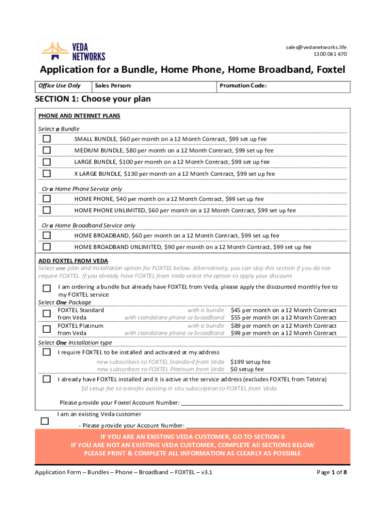 Sales@vedanetworks.life 1300 041 470Application for a Bundle, Home Phone, Home Broadband, Foxtel Office Use Telesales Person:Promotion Code:SECTION 1: Choose your plan PHONE AND INTERNET PLANS Select