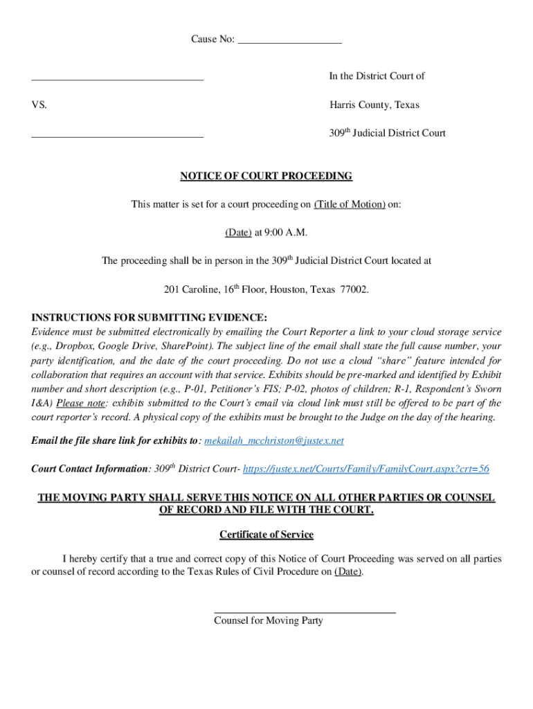 Cause No: ______In the District Court offs. Harris County, Texas___309th Judicial District CourtNOTICE OF COURT PROCEEDING This matter is set for a court proceeding on (Title of Motion) on: (Date)
