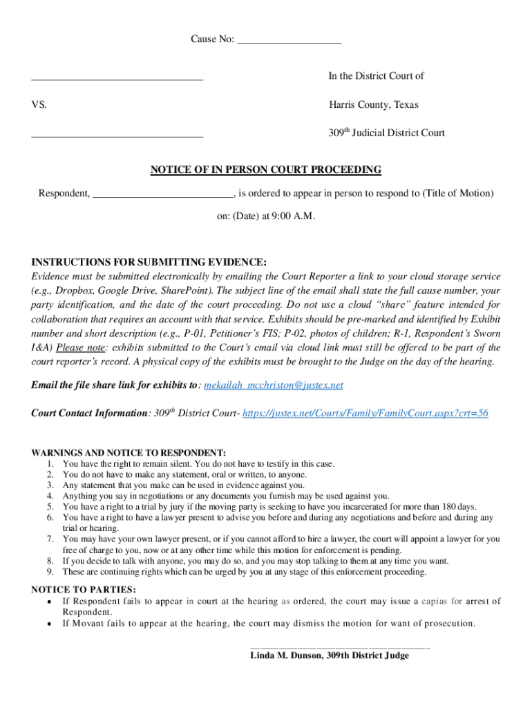 Cause No: ______In the District Court offs. Harris County, Texas___309th Judicial District CourtNOTICE OF IN PERSON COURT PROCEEDING Respondent, ___, is ordered to appear in person to respond to (Title
