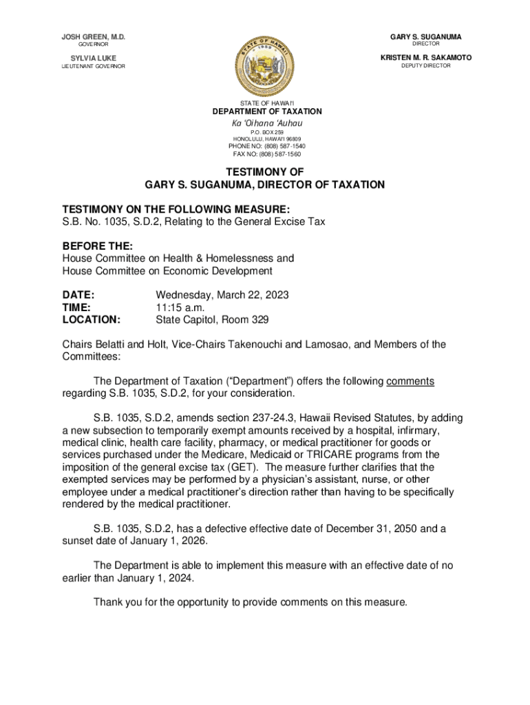 JOSH GREEN, M.D.GARY S. SUGANUMAGOVERNORDIRECTORSYLVIA LUKEKRISTEN M. R. SAKAMOTOLIEUTENANT GOVERNORDEPUTY DIRECTORATE OF HAWAIIDEPARTMENT OF Taxation Diana Aura