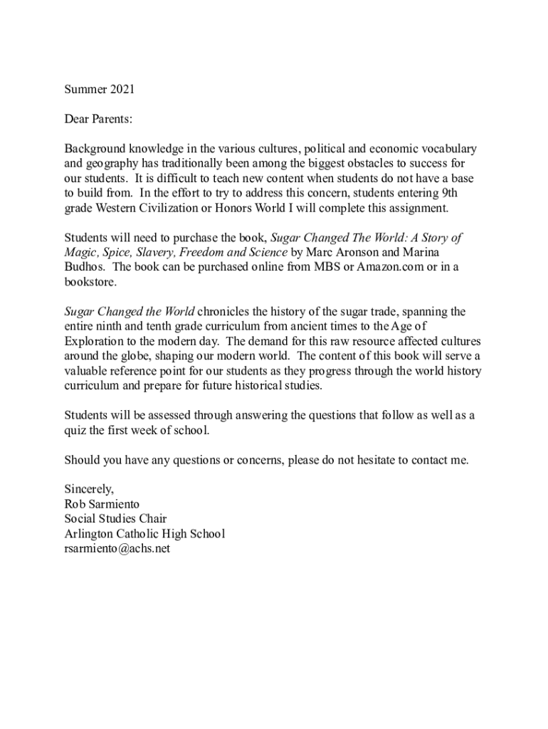 Get the free Sugar Changed the World - Summer Reading Assignment ...