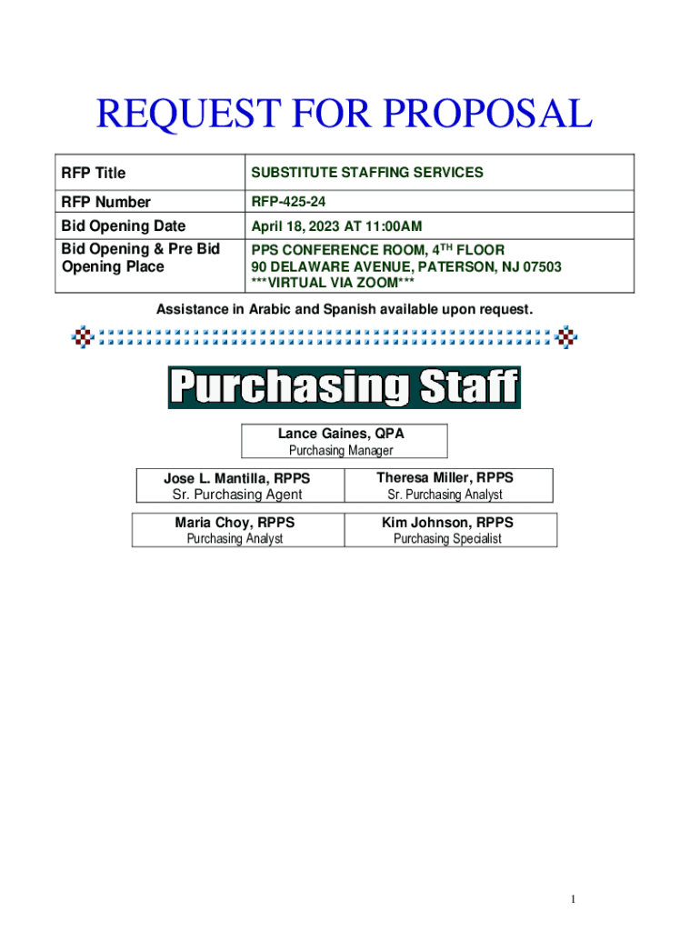 REQUEST FOR PROPOSAL RFP TitleSUBSTITUTE STAFFING SERVICES RFP NumberRFP42524Bid Opening Date Bid Opening & PRE Bid Opening Place April 18, 2023, AT 11:00AM PPS CONFERENCE ROOM, 4TH FLOOR 90 DELAWARE