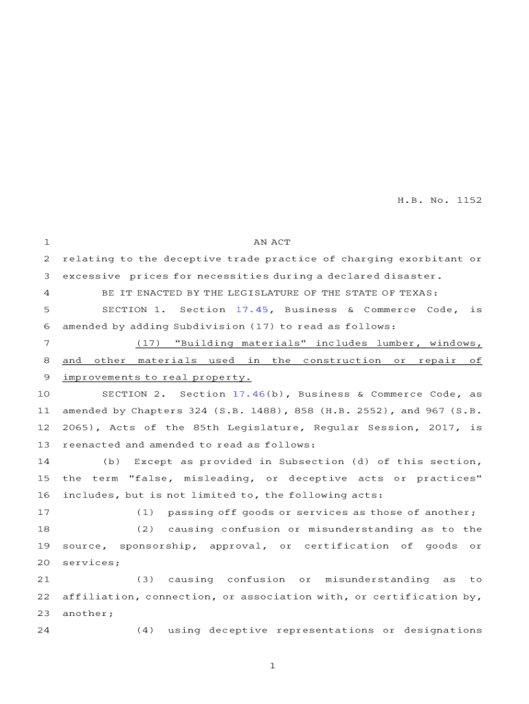H.B.ANO. A11521AN ACT2relating to the deceptive trade practice of charging exorbitant or3excessiveprices for necessities during a declared disaster.4BE IT ENACTED BY THE LEGISLATURE OF THE STATE OF