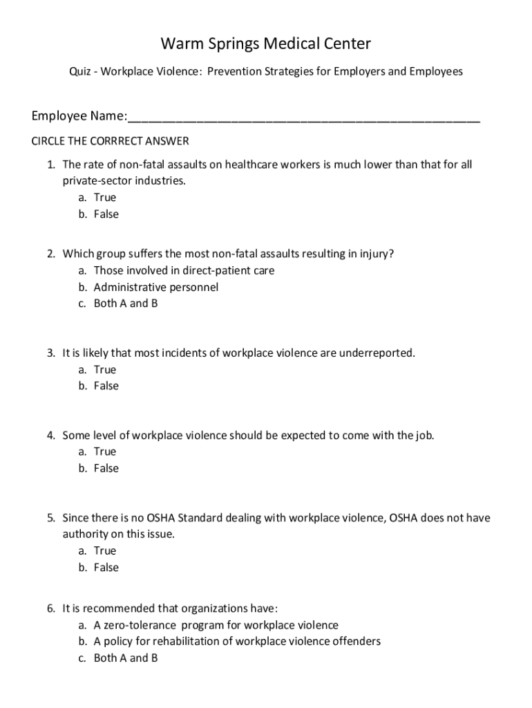 Warm Springs Medical Center Quiz Workplace Violence: Prevention Strategies for Employers and EmployeesEmployee Name:___ CIRCLE THE CORRECT ANSWER 1. The rate of nonfatal assaults on healthcare workers