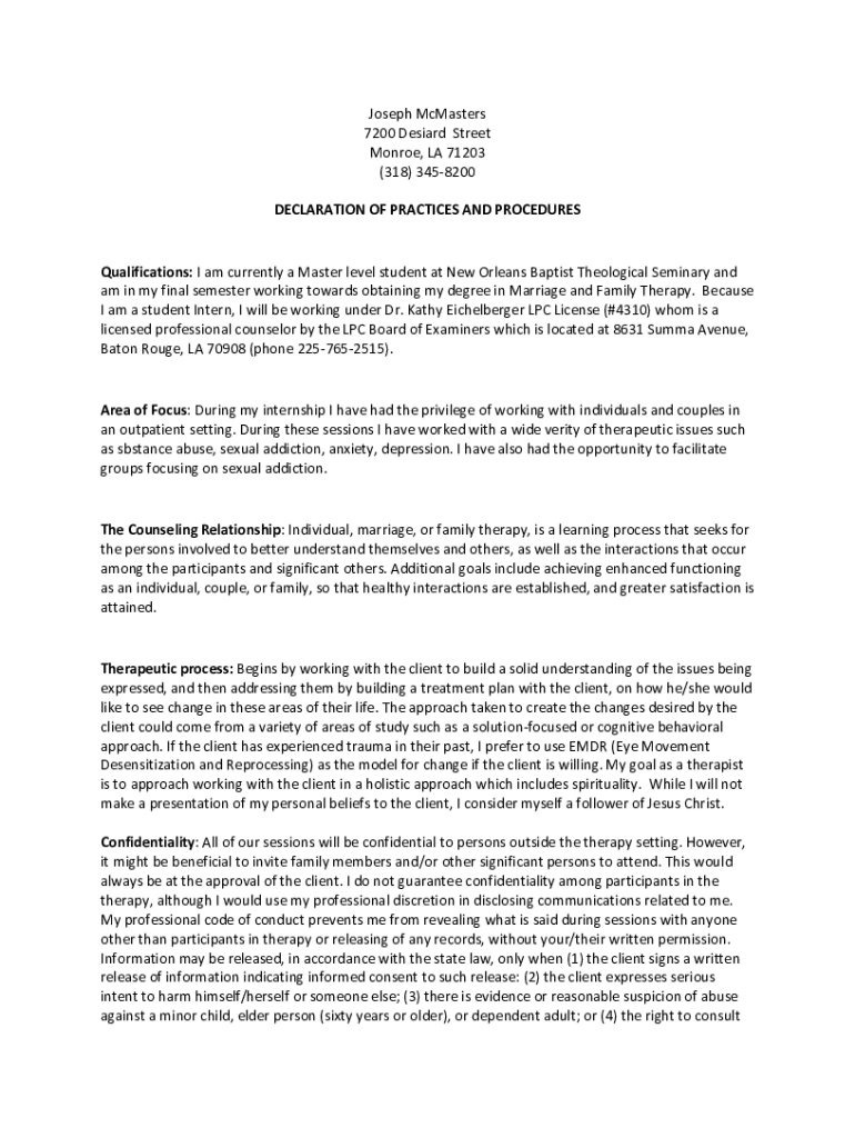 Joseph McMaster 7200 Desire Street Monroe, LA 71203 (318) 3458200 DECLARATION OF PRACTICES AND PROCEDURESQualifications: I am currently a Master level student at New Orleans Baptist Theological Seminary