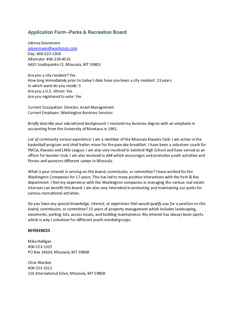 Application Form Parks & Recreation Board Johnny Riemann jeisenmann@washcorp.com Day: 4065231304 Alternate: 4062394533 6615 Outpointed Ct, Missoula, MT 59803 Are you a city resident? Yes How long