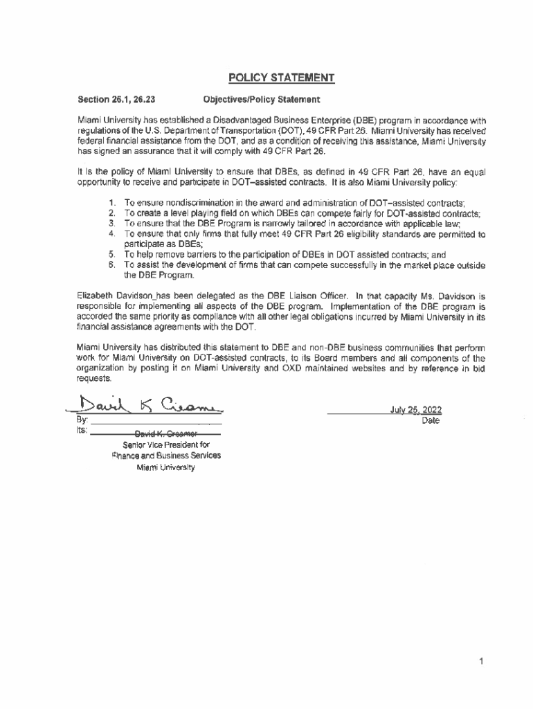 POLICY STATEMENT Section 26.1, 26.23Objectives/Policy Statement Miami University has established a Disadvantaged Business Enterprise (BE) program in accordance with regulations of the U.S. Department