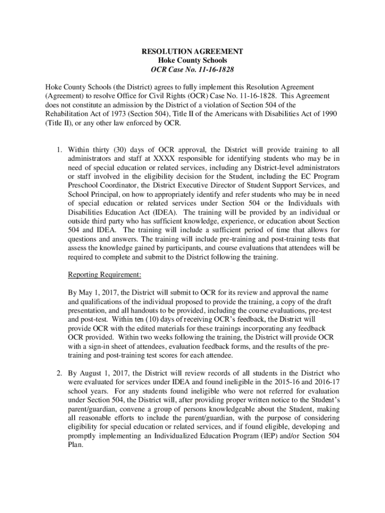 RESOLUTION AGREEMENT Hoke County Schools OCR Case No. 11161828 Hoke County Schools (the District) agrees to fully implement this Resolution Agreement (Agreement) to resolve Office for Civil Rights