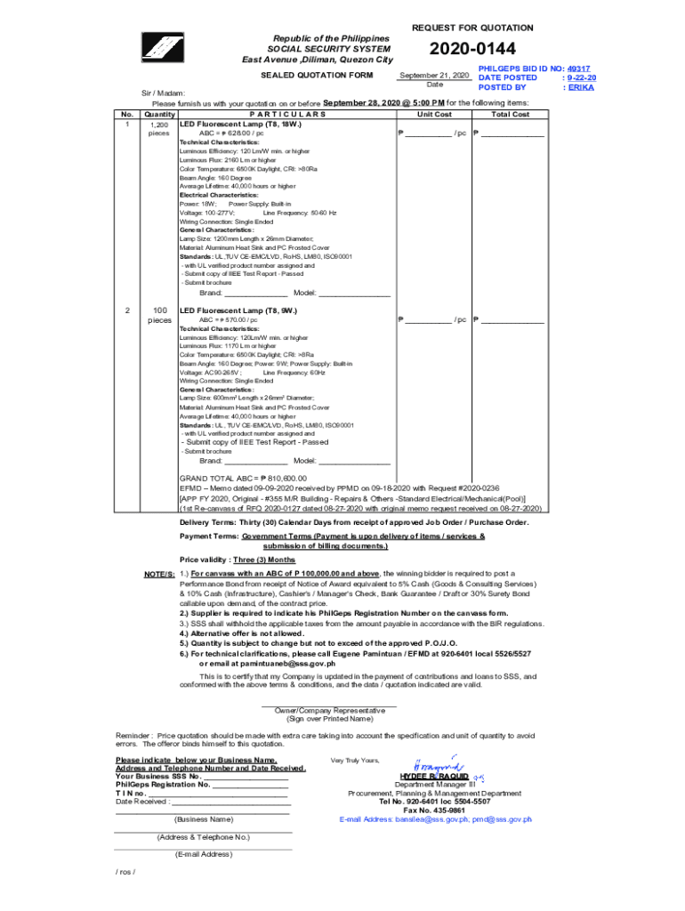 REQUEST FOR QUOTATION Republic of the Philippines SOCIAL SECURITY SYSTEM East Avenue, Dalian, Quezon City SEALED QUOTATION FORM20200144 September 21, 2020, DatePHILGEPS BID ID NO: 49317 DATE POSTED