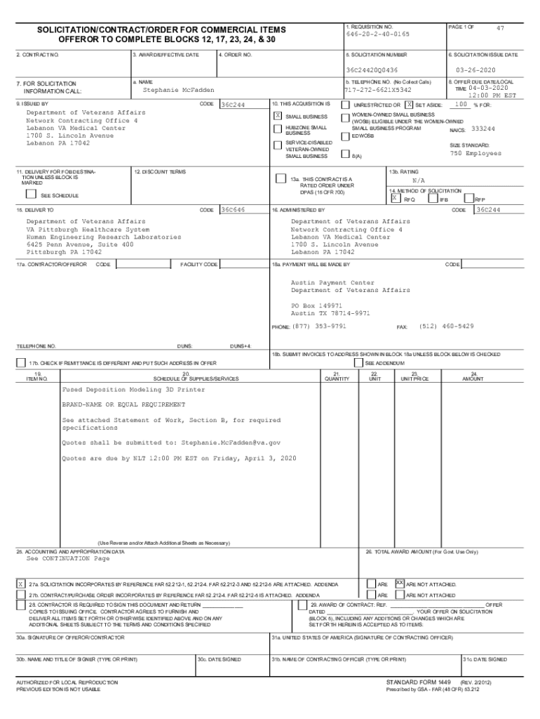 SOLICITATION/CONTRACT/ORDER FOR COMMERCIAL ITEMS OFFER OR TO COMPLETE BLOCKS 12, 17, 23, 24, & 30 2. CONTRACT NO.3. AWARD/EFFECTIVE AVERAGE 1 OF5. SOLICITATION NUMBER6. SOLICITATION ISSUE DATE6462024001654.