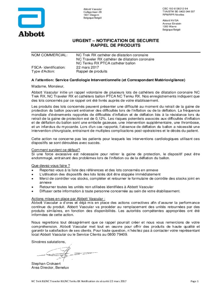 Abbott Vascular Culliganlaan 2B 1831 Die gem Belgium/Belgian 192613821294 TVA/BTW BE0403 044 007 RPM/RPR Novellas Abbott NV/SA Avenue Einstein 1300 Wave Belgium/BelgiURGENT NOTIFICATION DE SECURITY