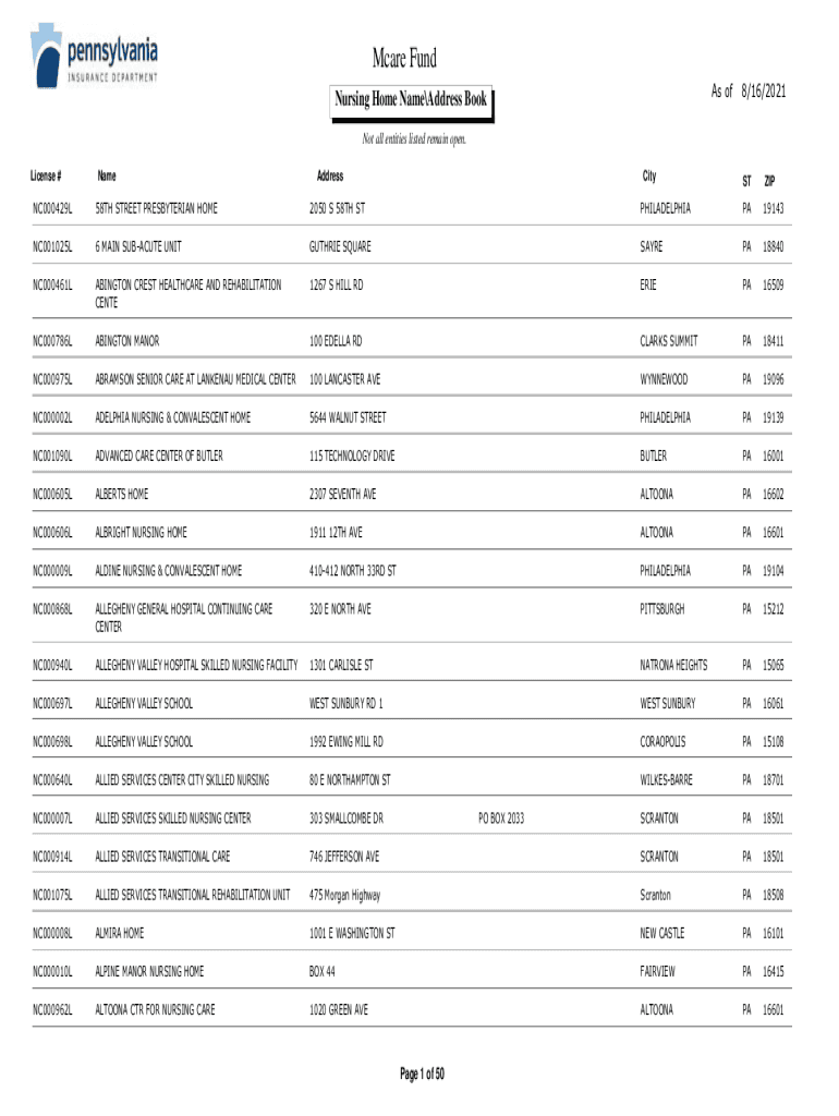 License #NameAddressCitySTZIPNC000429L58TH STREET PRESBYTERIAN HOME2050 S 58TH STPHILADELPHIAPA19143NC001025L6