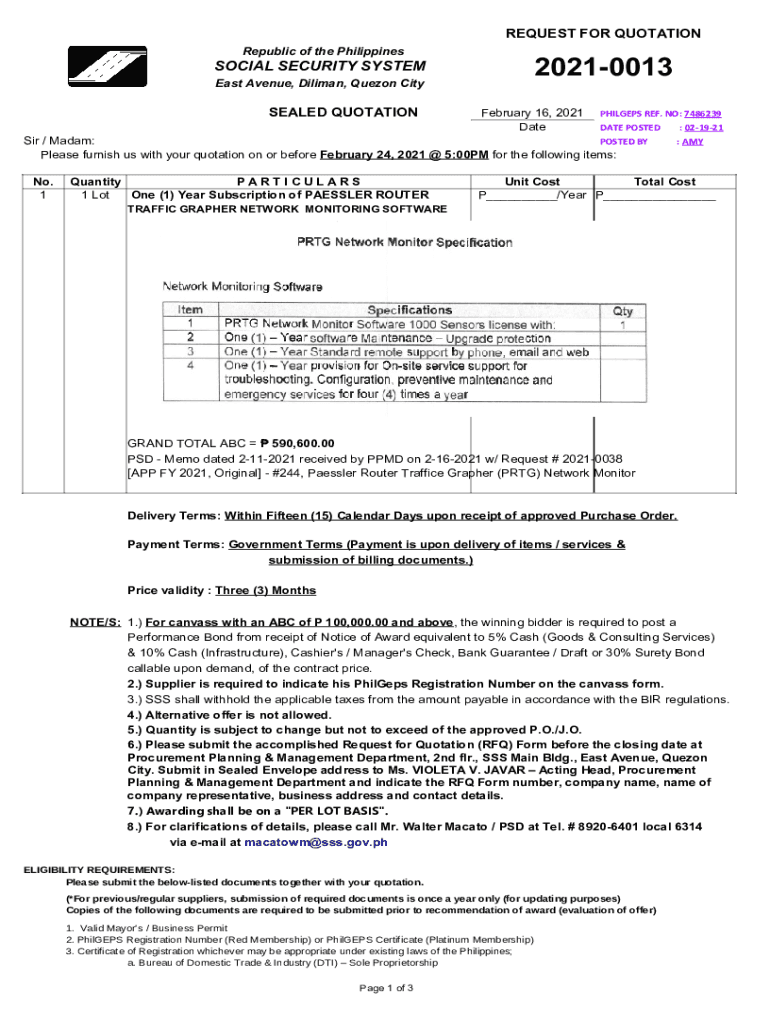 REQUEST FOR QUOTATION Republic of the Philippines20210013SOCIAL SECURITY SYSTEM East Avenue, Dalian, Quezon Cityscape QUOTATION February 16, 2021, DatePHILGEPS REF. NO: 7486239 DATE POSTED : 021921Sir