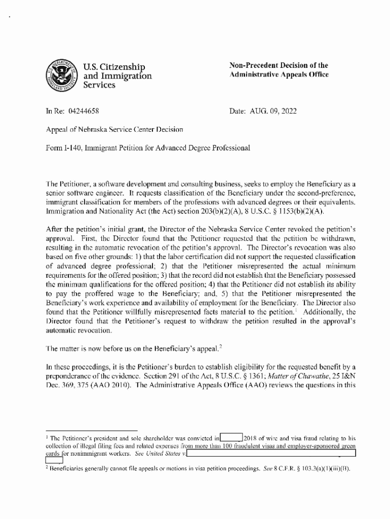 U.S. Citizenship and Immigration Services In Re: 04244658NonPrecedent Decision of the Administrative Appeals Officiate: AUG. 09, 2022Appeal of Nebraska Service Center Decision Form 1140, Immigrant