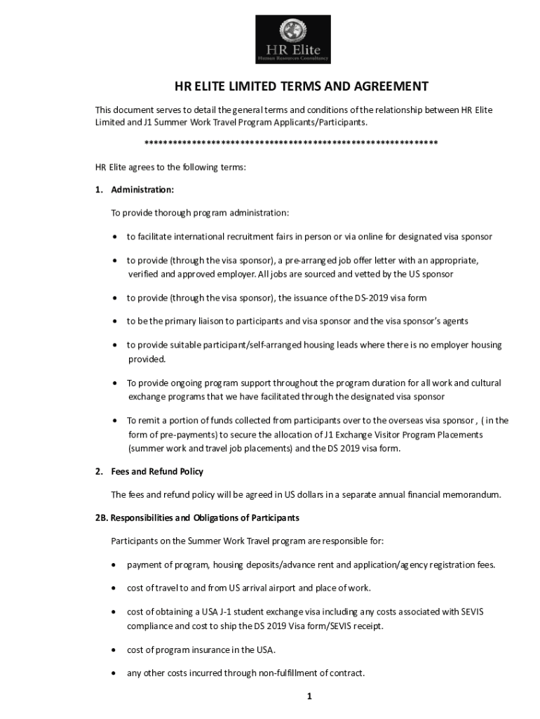 HR ELITE LIMITED TERMS AND AGREEMENT This document serves to detail the general terms and conditions of the relationship between HR Elite Limited and J1 Summer Work Travel Program Applicants/Participants.