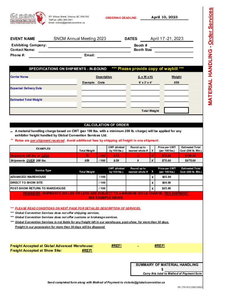 April 10, 2023ORDERING DEADLINE:SNCM Annual Meeting 2023EVENT NAME April 17 21, 2023DATESExhibiting Company: Contact Name:MATERIAL HANDLING Order Services671 Wilson Street, Victoria, BC V9A 3H3 Tel/Fax: