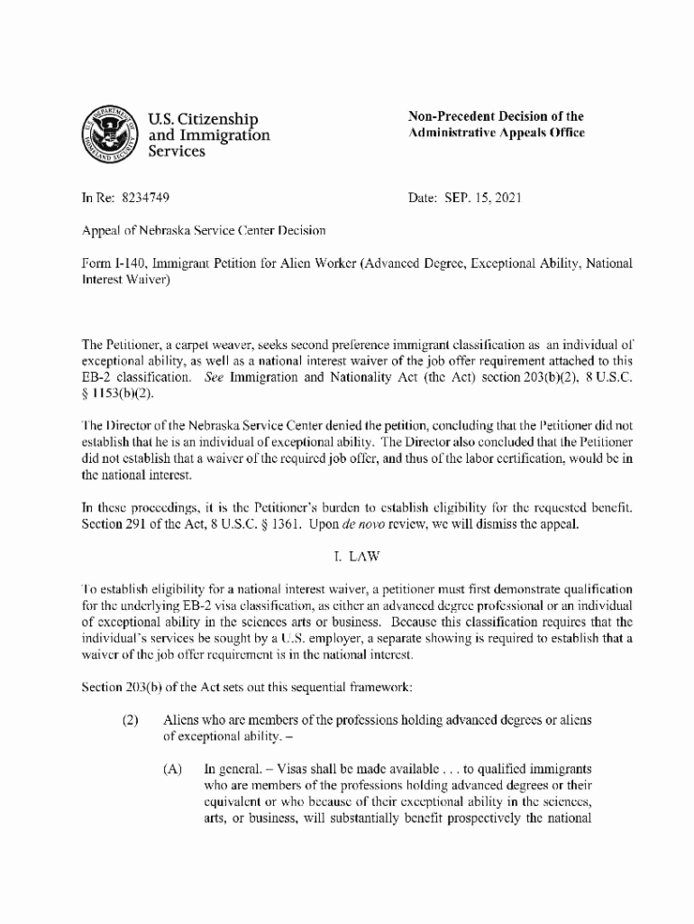 Precedent Decision of the Administrative Appeals Office. S. Citizenship and Immigration Services In Re: 8234 749Date: SEP. 15, 2021Appeal of Nebraska Service Center Decision Form 1140, Immigrant Petition