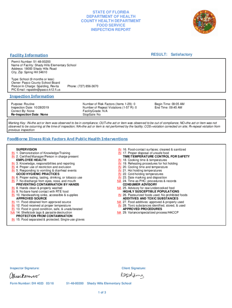 STATE OF FLORIDA DEPARTMENT OF HEALTH COUNTY HEALTH DEPARTMENT FOOD SERVICE INSPECTION REPORTRESULT: SatisfactoryFacility Information Permit Number: 514800200 Name of Facility: Shady Hills Elementary