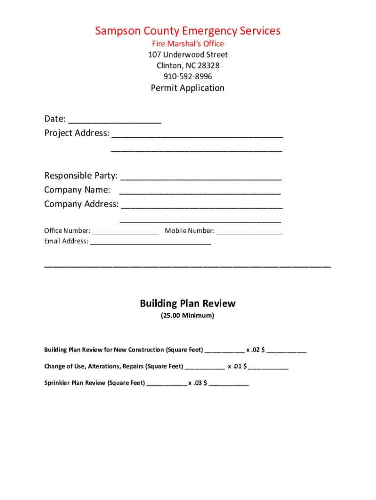 Sampson County Emergency Services Fire Marshals Office 107 Underwood Street Clinton, NC 28328 9105928996Permit ApplicationDate: ___ Project Address: ___ ___ Responsible Party: ___ Company Name: ___