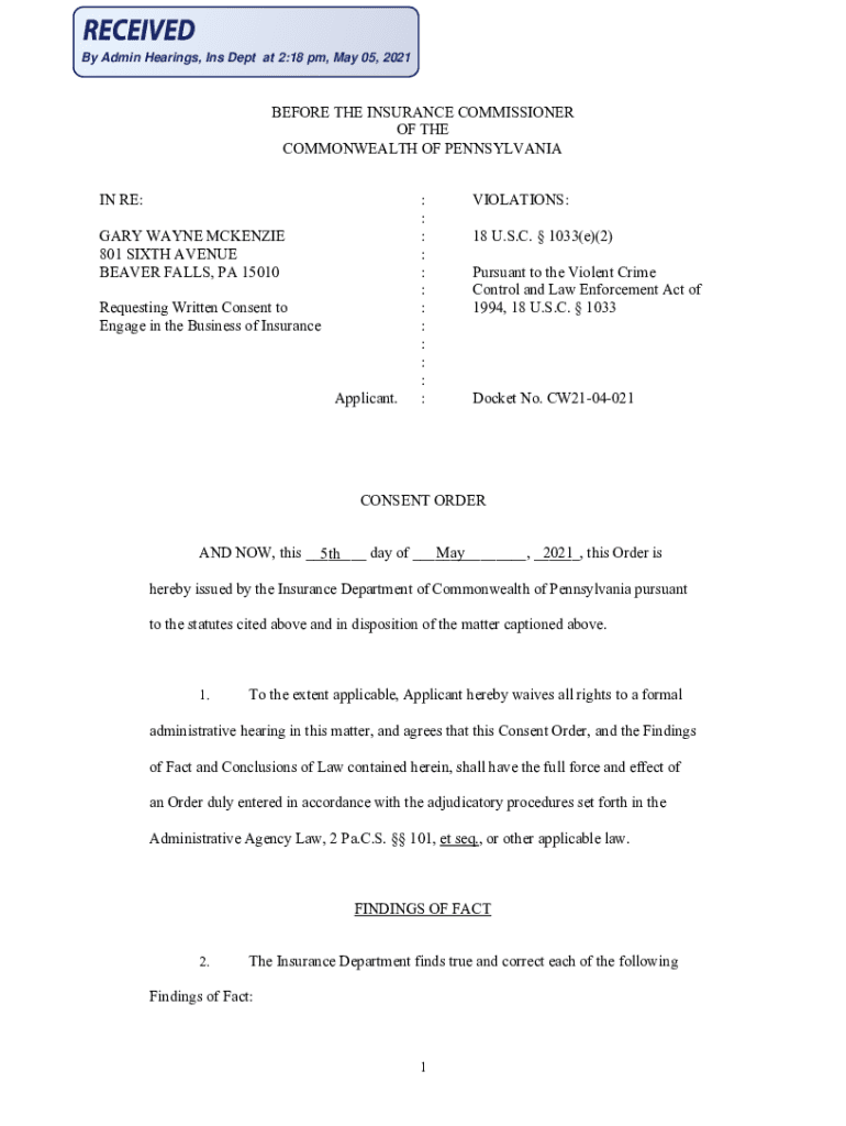 By Admin Hearings, Ins Dept at 2:18 pm, May 05, 2021BEFORE THE INSURANCE COMMISSIONER OF THE COMMONWEALTH OF PENNSYLVANIA IN RE: GARY WAYNE McKenzie 801 SIXTH AVENUE BEAVER FALLS, PA 15010 Requesting