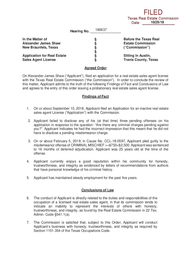 10/29/19 190637 Hearing No. ___ In the Matter of Alexander James Shaw New Braunfels, Texas Application for Real Estate Sales Agent License Before the Texas Real Estate Commission (Commission) Sitting