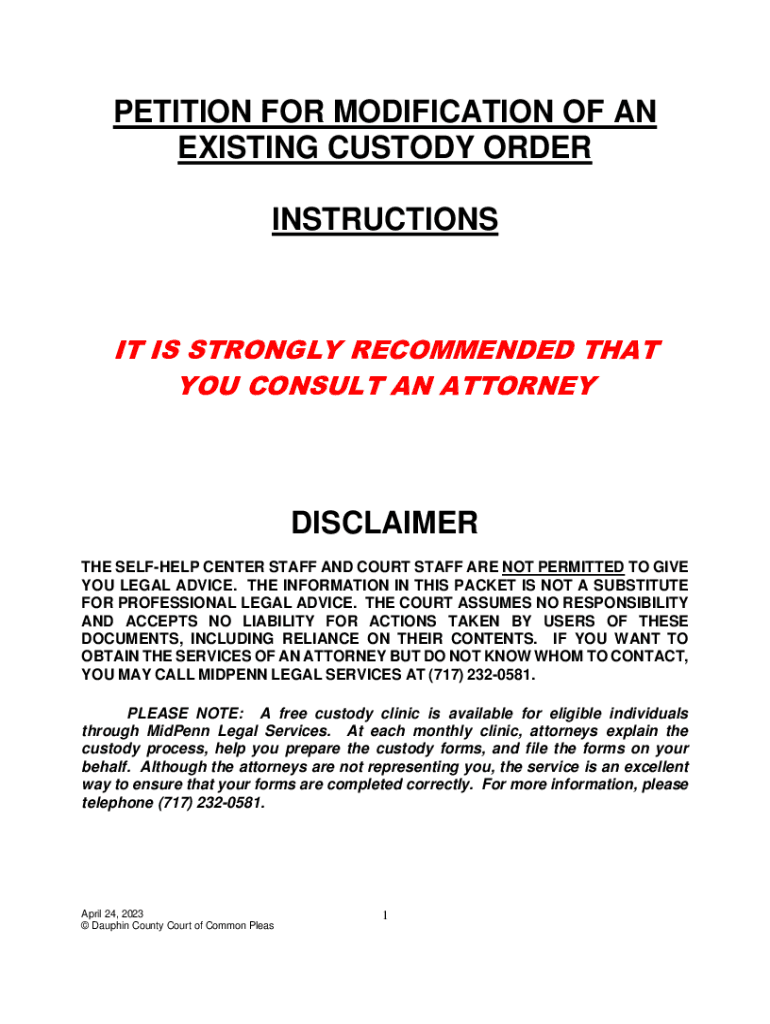 PETITION FOR MODIFICATION OF AN EXISTING CUSTODY ORDER INSTRUCTION SIT IS STRONGLY RECOMMENDED THAT YOU CONSULT AN ATTORNEYDISCLAIMER THE SELFLESS CENTER STAFF AND COURT STAFF ARE NOT PERMITTED TO