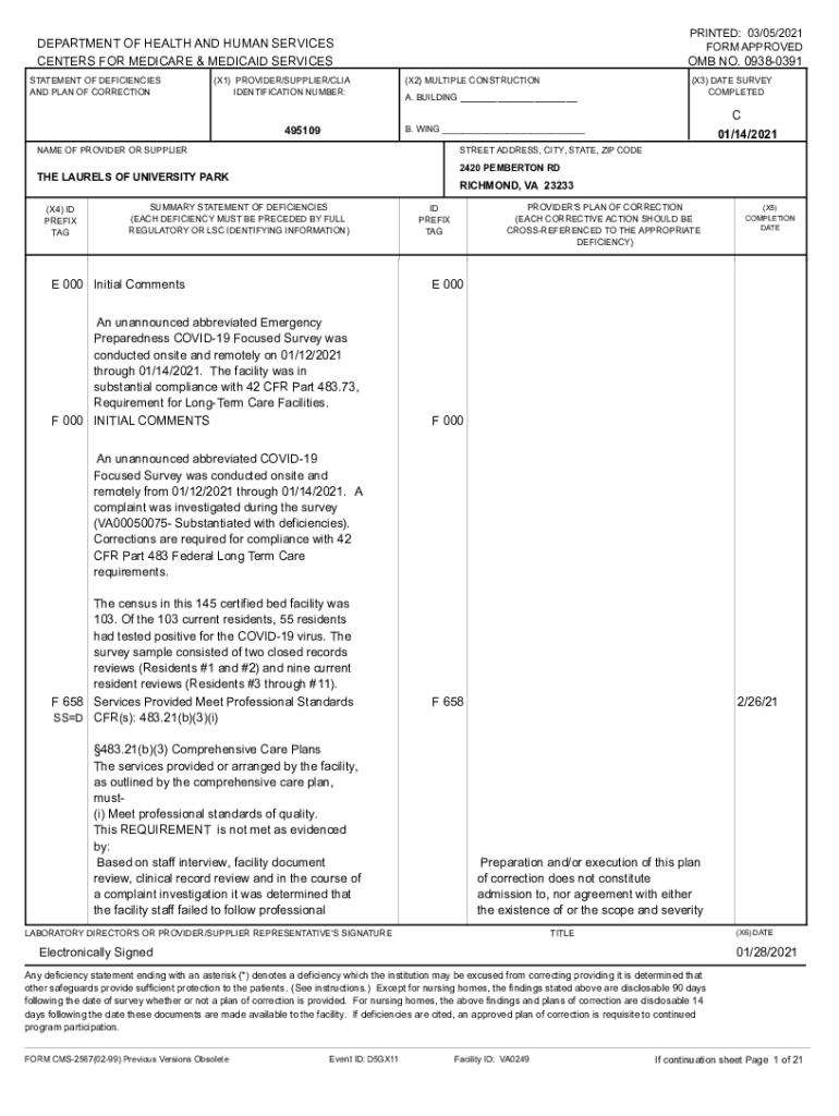 PRINTED: 03/05/2021 FORM APPROVEDDEPARTMENT OF HEALTH AND HUMAN SERVICES CENTERS FOR MEDICARE & MEDICAID SERVICES STATEMENT OF DEFICIENCIES AND PLAN OF CORRECTION(X1) PROVIDER/SUPPLIER/CIA IDENTIFICATION