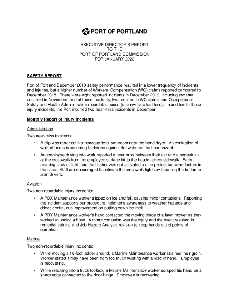 EXECUTIVE DIRECTORS REPORT TO THE PORT OF PORTLAND COMMISSION FOR JANUARY 2020SAFETY REPORT Port of Portland December 2019 safety performance resulted in a lower frequency of incidents and injuries,