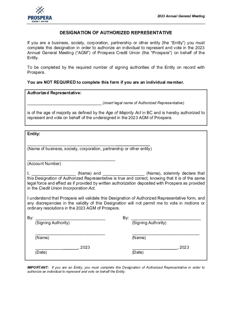 2023 Annual General MeetingDESIGNATION OF AUTHORIZED REPRESENTATIVE If you are a business, society, corporation, partnership or other entity (the Entity) you must complete this designation in order