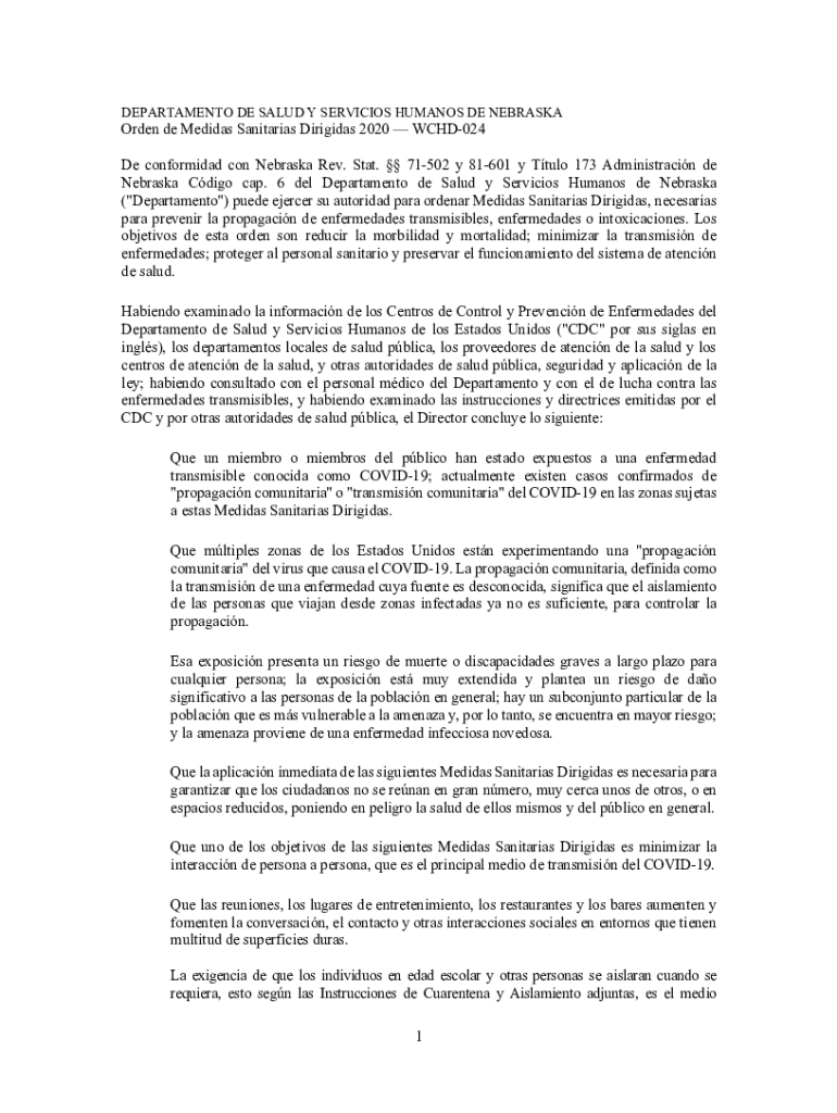 DEPARTMENT DE SALAD Y SERVICES HUMANS DE NEBRASKAOrden de Medidas Sanitarian Dirigible 2020 WCHD024De conforming con Nebraska Rev. Stat. 71502 y 81601 y Truly 173 Administration de