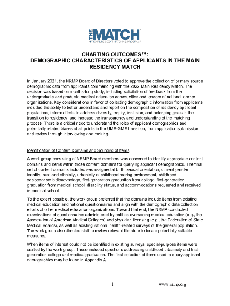 CHARTING OUTCOMES: DEMOGRAPHIC CHARACTERISTICS OF APPLICANTS IN THE MAIN RESIDENCY MATCH In January 2021, the NDMP Board of Directors voted to approve the collection of primary source demographic