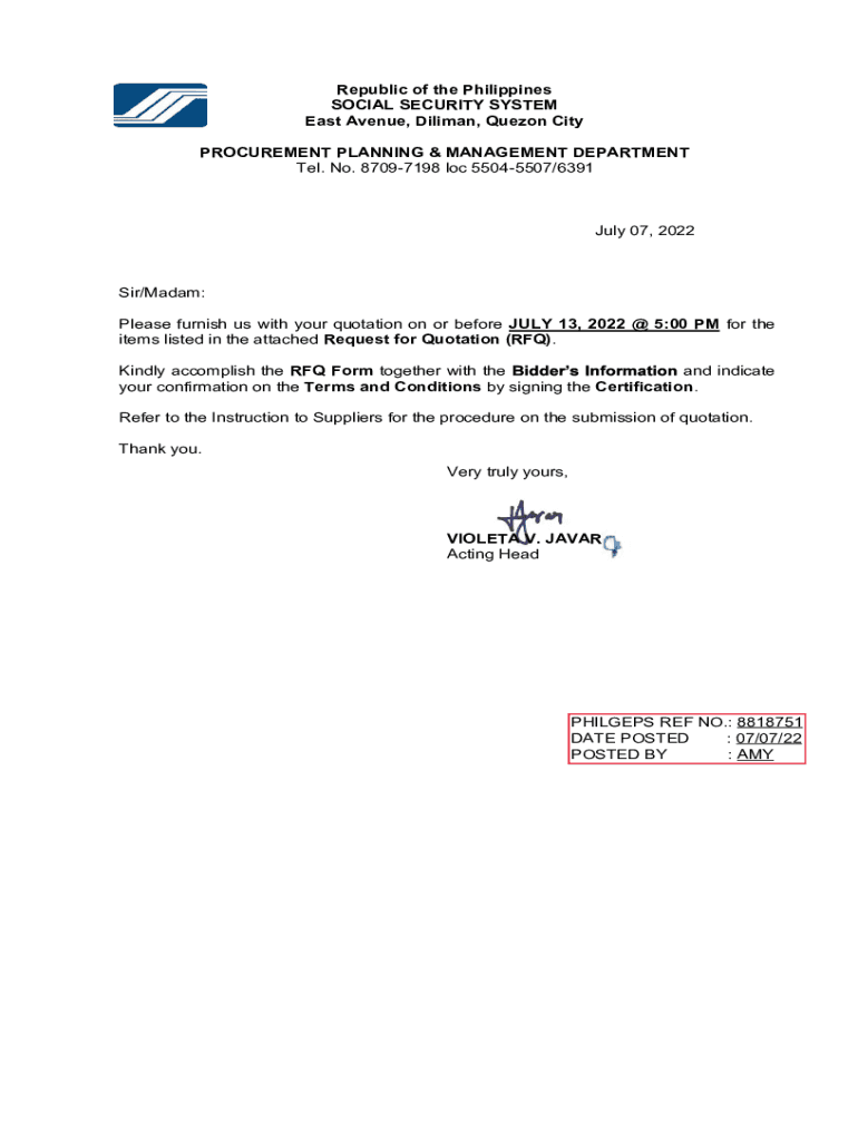Republic of the Philippines SOCIAL SECURITY SYSTEM East Avenue, Dalian, Quezon City PROCUREMENT PLANNING & MANAGEMENT DEPARTMENT Tel. No. 87097198 LOC 55045507/6391July 07, 2022Sir/Madam: Please furnish