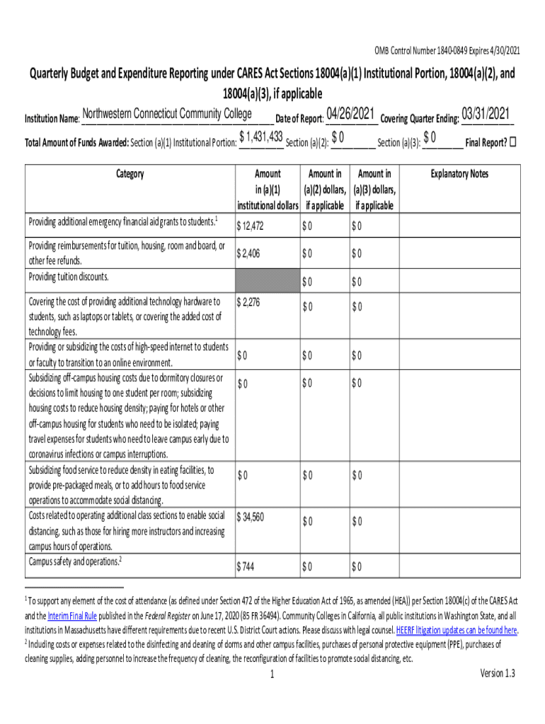 OMBControlNumber18400849Expires4/30/2021 QuarterlyBudgetandExpenditureReportingunderCARESActSections18004(a)(1)Institutionalization,18004(a)(2), and 18004(a)(3), inapplicable Northwestern Connecticut